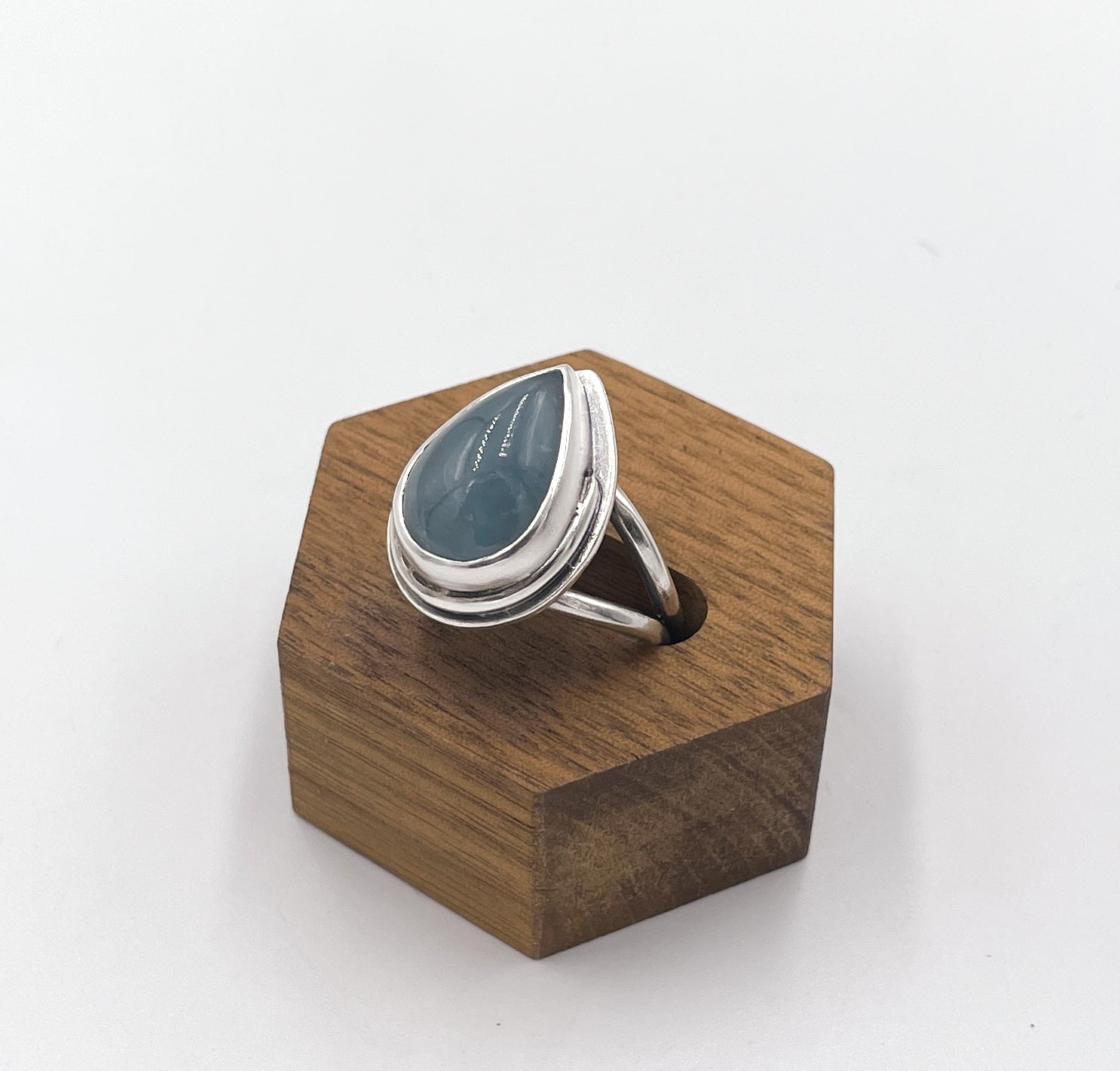 A teardrop shape aquamarine and sterling silver ring with wire detail around bezel. SIZE 7.5
