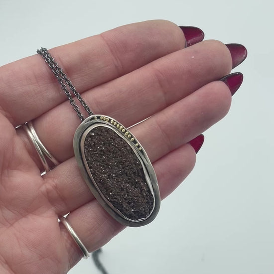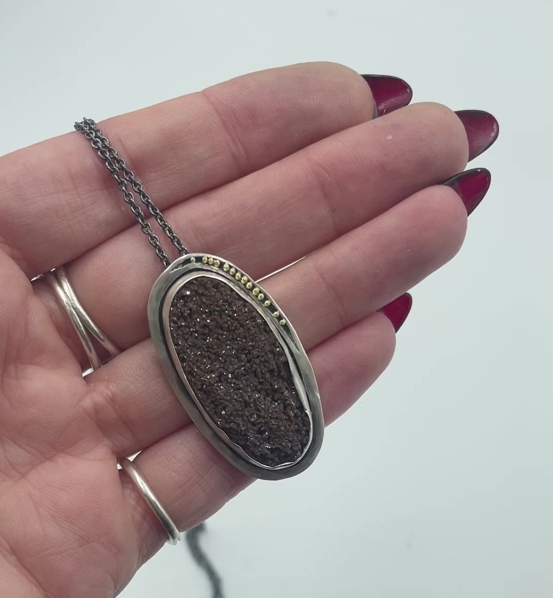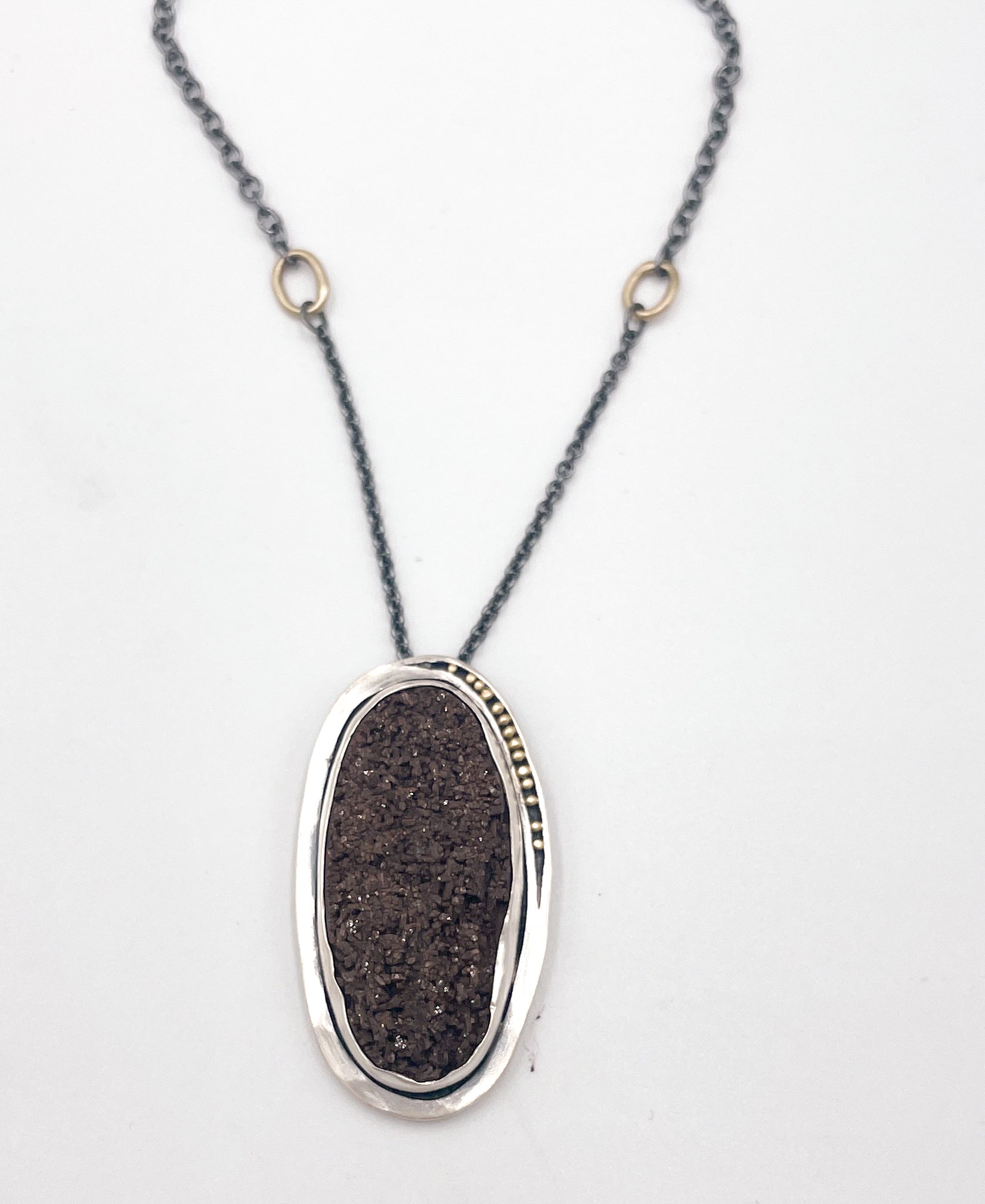 A lush petrified wood with druzy surface is set in sterling silver with 18k gold granules adorning the side. 14k gold detail along the chain as well. Chain length is 24 inches, but can be changed upon request.