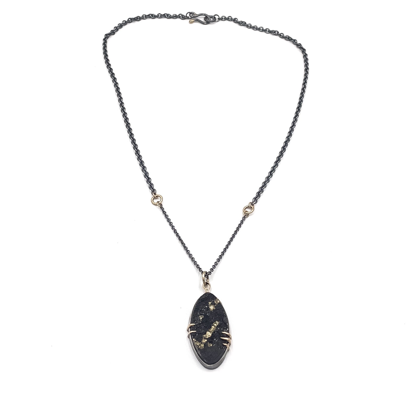 Pyrite in schist is set in sterling silver with gold prongs and gold link details in the chain. 18 inches. Can be a different length if you specify.